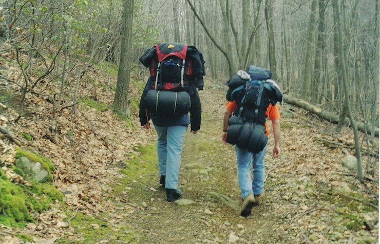 The animal began making its way slowly towards the men. The first friend then bent down after opening his backpack to wear a pair of sneakers.