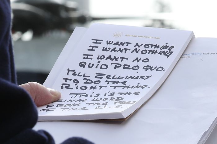 The about-to-be impeached Trump holds hand-Sharpied talking points during a White House press conference on November 20, 2019 regarding his attempt to pressure the government of Ukraine to launch an investigation into the Biden family. Photo: Mark Wilson/Getty Images