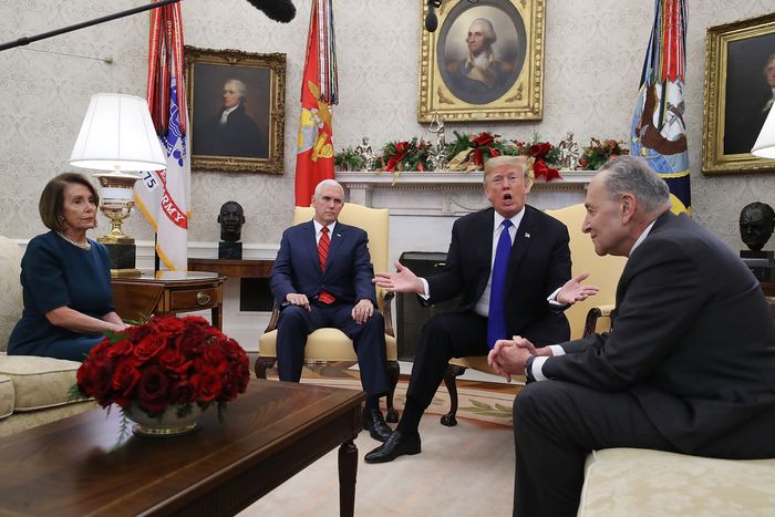 Trump lectures Chuck Schumer and Nancy Pelosi about border security, as Mike Pence looks on, during a December 11, 2018 meeting in the Oval Office — less than two weeks before Trump ordered what became the longest and most pointless government shutdown in U.S. history. Photo: Mark Wilson/Getty Images